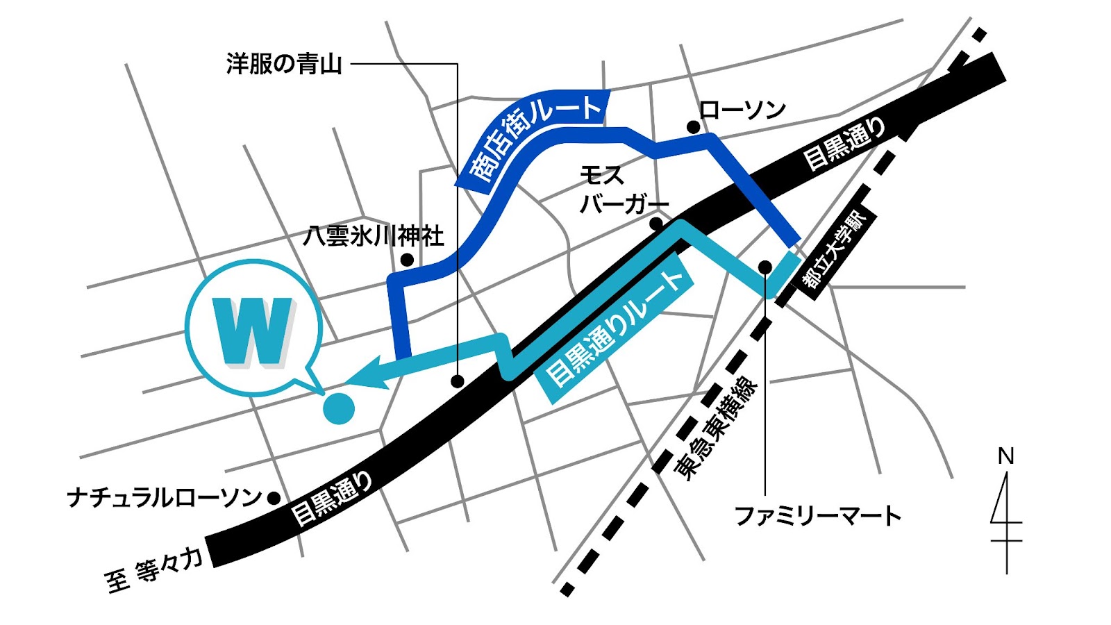 都立大学駅北口を左折、さらに駅前のパチンコを左折、すぐの緑道を右折。